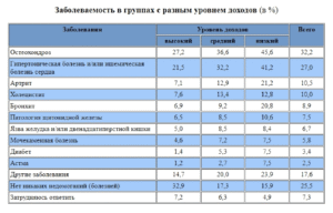 Резкое (в 2-3 раза) увеличение доли респондентов, имеющих заболевания, в сравнении со средними показателями по массиву обследованных, наблюдается, начиная с возрастной группы 50-59 лет. Рост числа заболеваний остеохондрозом начинается с возрастной группы 40-49 лет. Но наиболее существенные различия по показателю заболеваемости выявились в слоях населения с разным уровнем доходов (таблица 1).