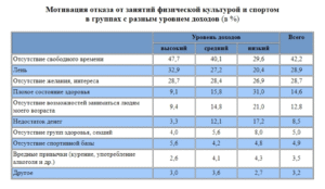 На охват населения физической культурой и спортом (как и в других областях жизни) оказывает большое влияние социальное расслоение. Это отражено в таблице 4.