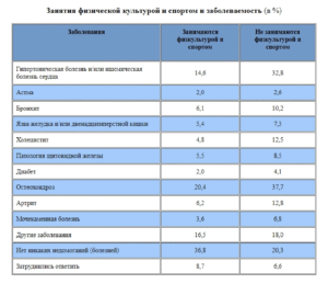 Между занятиями физкультурой и спортом и состоянием здоровья существует как прямая, так и обратная связь: люди, не склонные к заболеваниям, охотнее ведут активный образ жизни, а занимающиеся физкультурой меньше болеют. Это демонстрируют результаты опроса, изложенные в таблице 5.